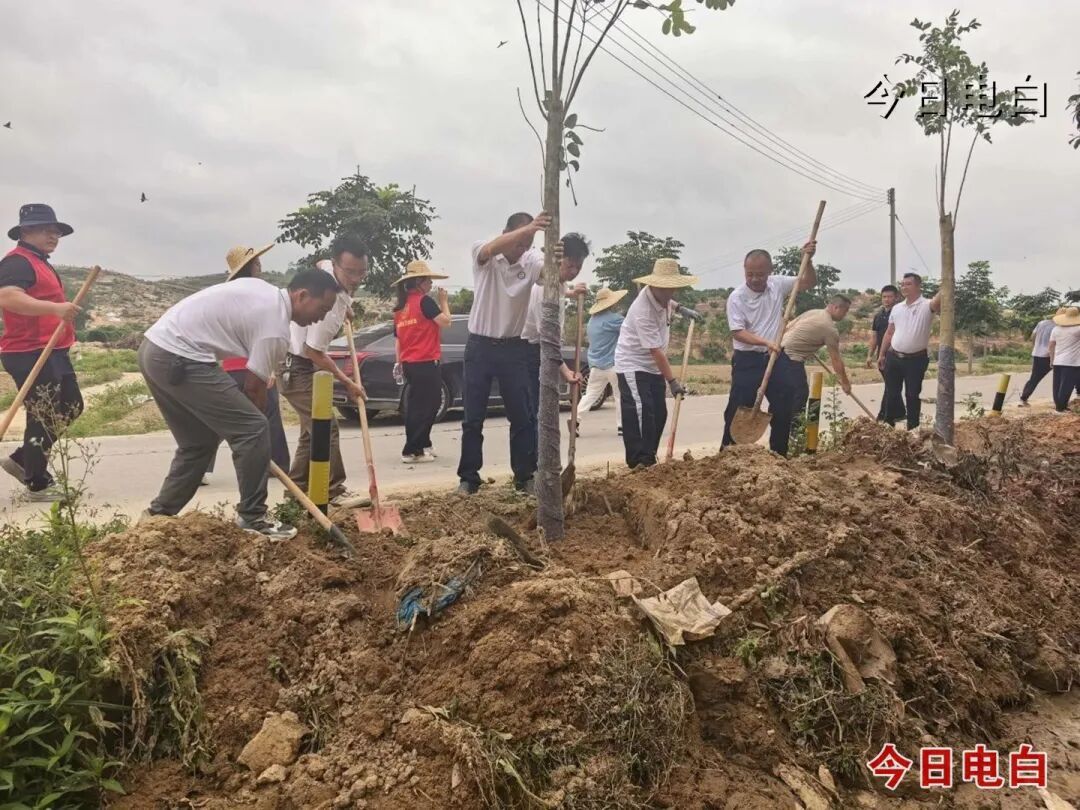 活动现场气氛热烈,大家分工协作、干劲十足。镇领导班子和商会代表带头挥锹挖坑、扶苗填土,村“两委”干部负责浇水养护,每个环节、每个动作都分工明确、有条不紊、认真细致。商会企业家们踊跃参与,积极捐赠树苗、保障物资,用双手栽下一棵棵新苗,展现出热爱家乡、建设家乡的责任与担当。